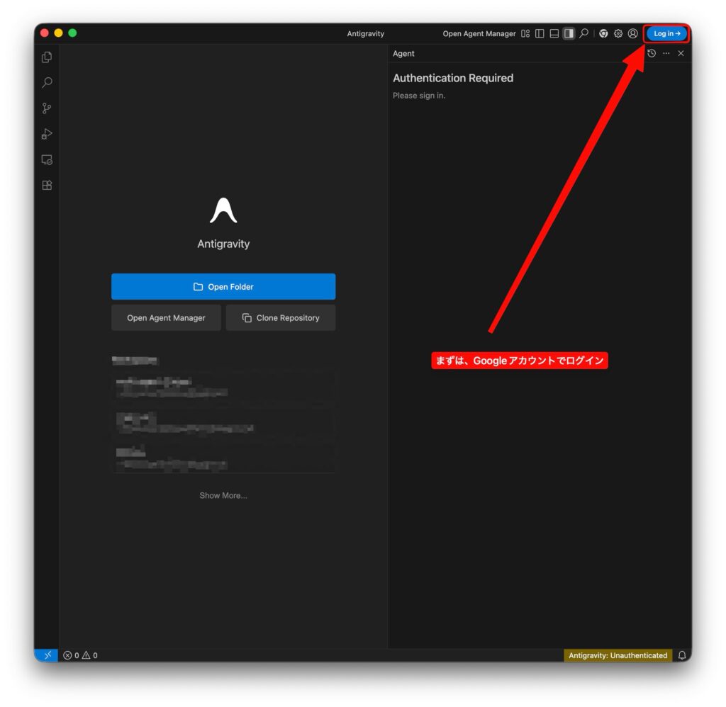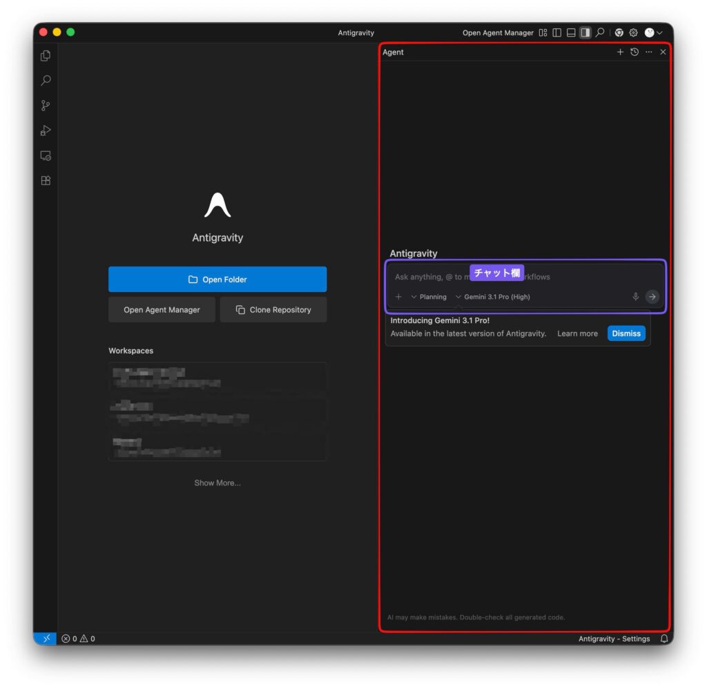 ログイン後のAntigravityの画面です。右側ペインがAIエージェントです。