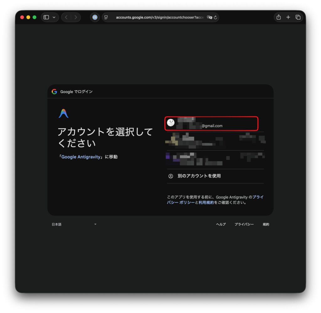ブラウザが開き、Googleアカウントでのログイン画面になります。複数アカウントを持っている場合は使用するGoogleアカウントを選択します。