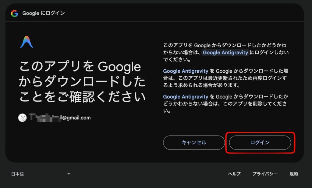 まずは、Google Antigravityのサイトへアクセスし自分の環境に合ったものをインストールしてください。
