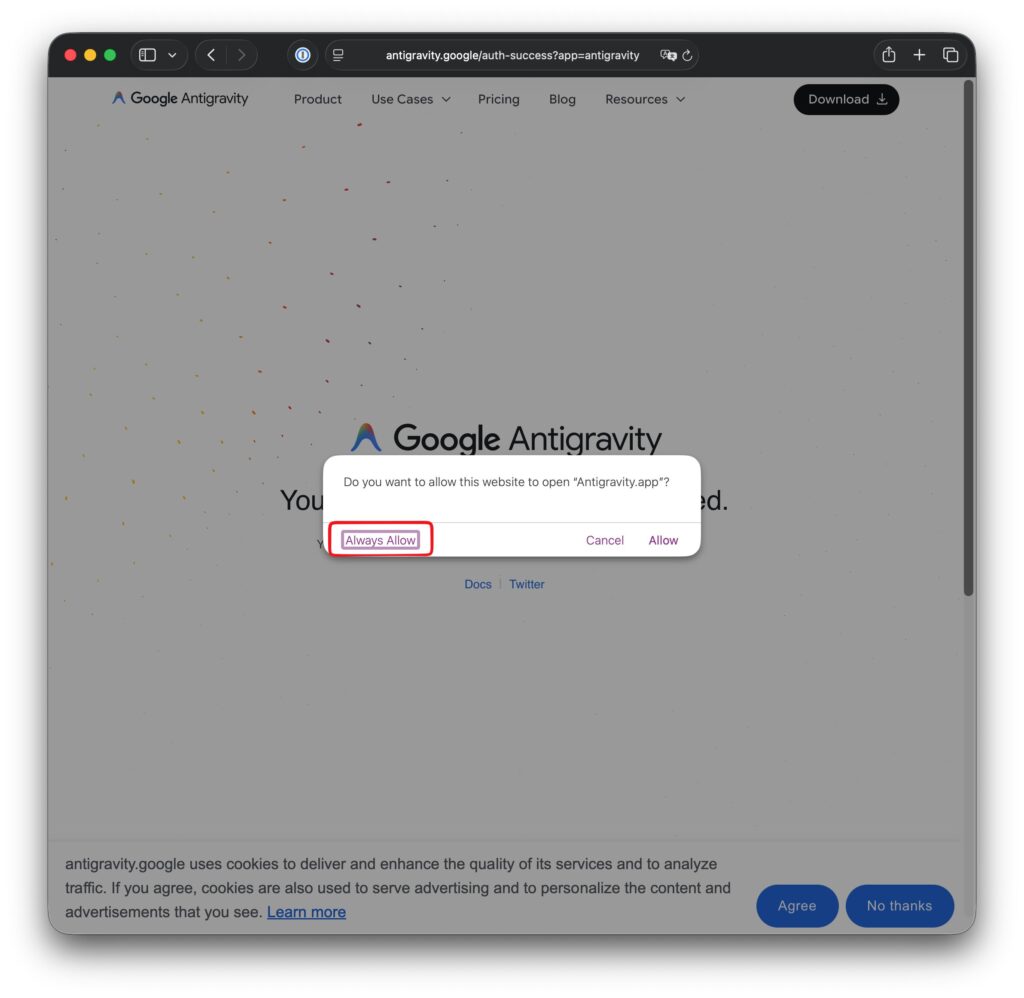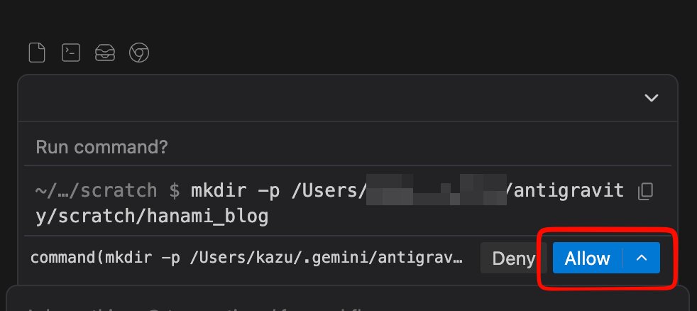 Antigravityが必要によりブラウザを使用する許可を与えます。