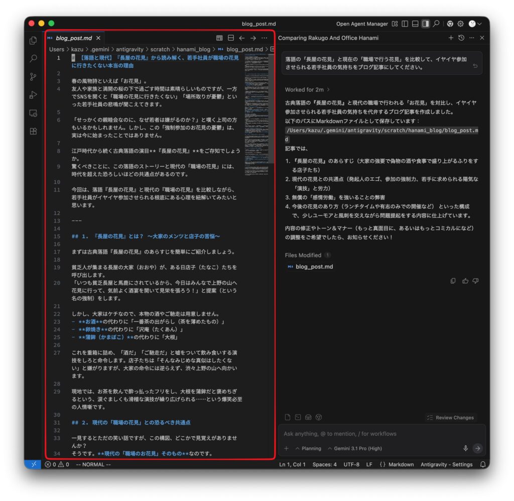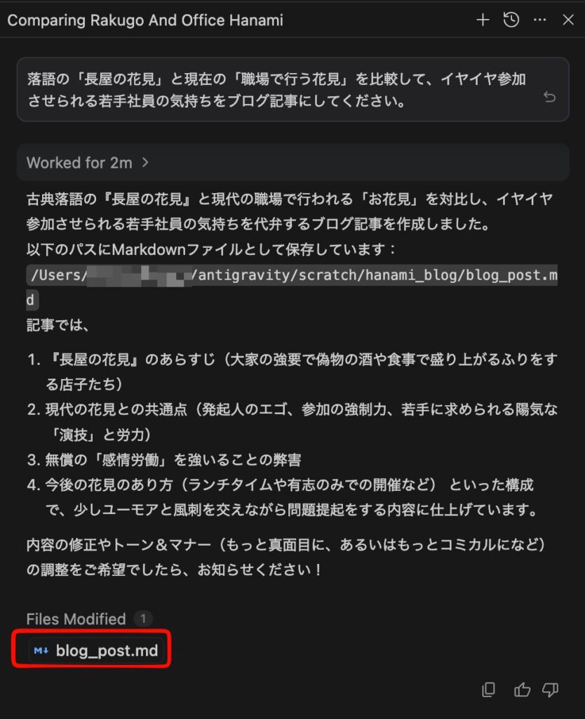AIエージェントが仕事を完了し、結果をファイルとして保存しています。ファイルをクリックすると内容が左ペインに表示されます。