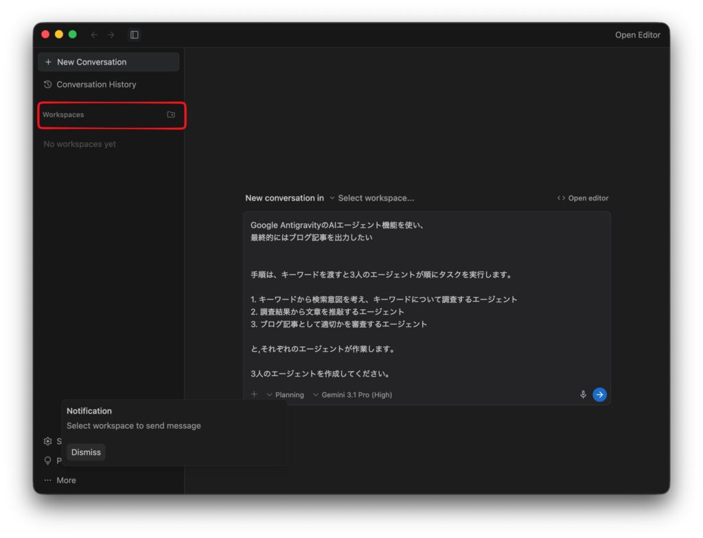 チャット欄にAIエージェントの作成依頼を行います。