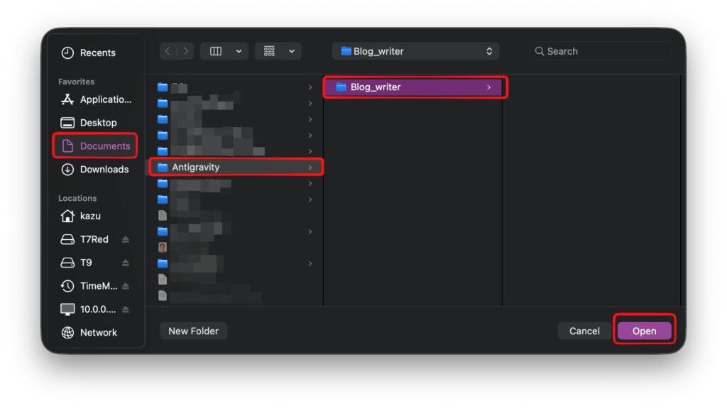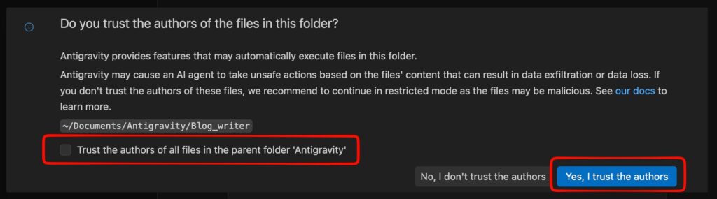 このフォルダにAntigravityの成果物を置く許可を求めてきますので、著者(Antigrabity)を信用するボタンをクリックします。