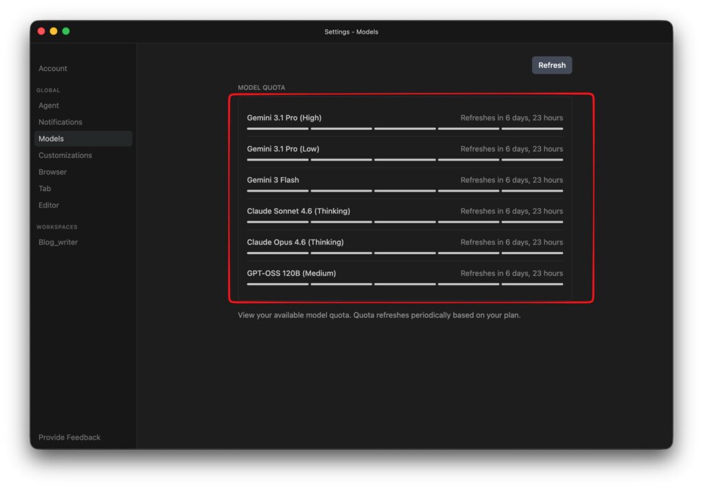 エージェントウィンドウの左下「Settings」ボタンをクリックし、左メニュー「Model」をクリックします。