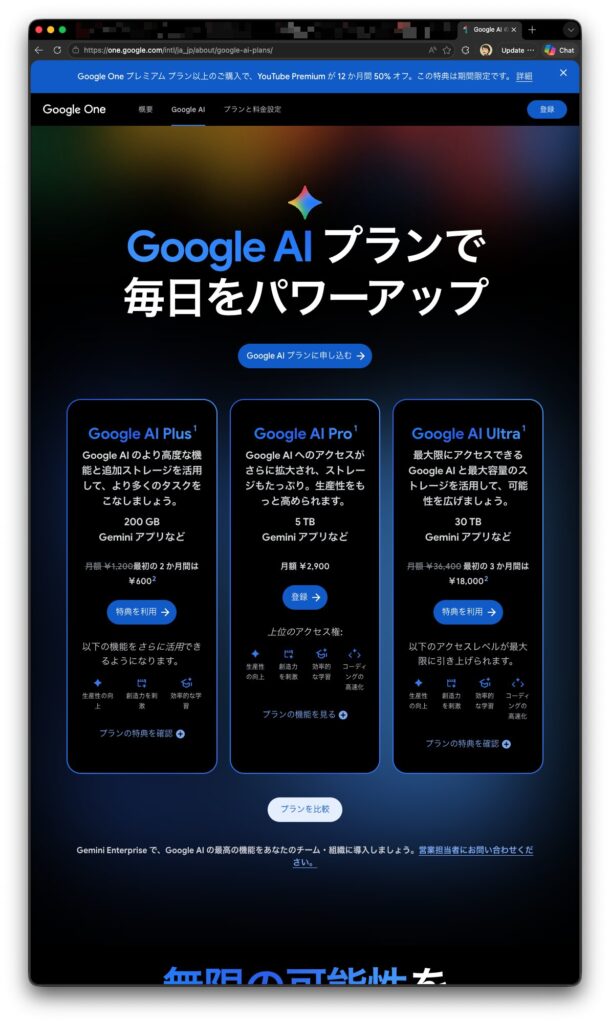 Googleの場合、個人では以下の有料プランがあります。