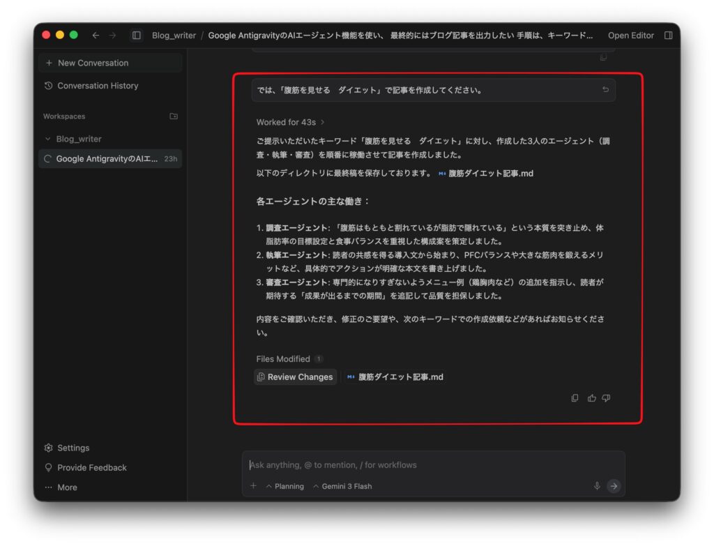 チャット欄に「では、「腹筋を見せる ダイエット」で記事を作成してください。」と指示し実行します。